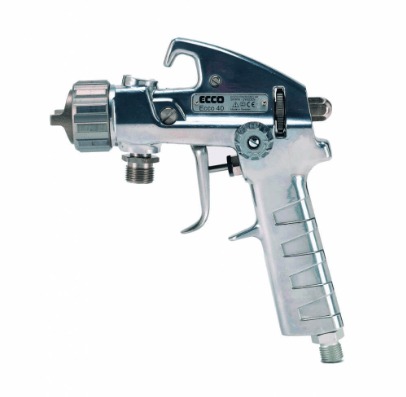 La pistola de pulverización de alimentación a presión Ecco 40S, en la que el material fluido se suministra desde un depósito a presión, una bomba o desde un sistema de circulación. Para tipos de pintura normales, utilice una pistola equipada con un juego de boquillas estándar, con boquilla de aire y boquilla de fluido de acero inoxidable y con una aguja de pintura de plástico. Para pinturas abrasivas y al agua, utilice siempre una pistola con boquilla de aire, boquilla de fluido y aguja de carburo de tungsteno.