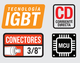 Voltaje de alimentación: 220V/1F Frecuencia: 60 Hz Rango amperaje Electrodo: 10-200A Rango amperaje TIG HF: 5-200A Rango amperaje Plasma: 20-50A Capacidad de electrodo: 3/32”-1/8” Voltaje en vacío: 64V Consumo: 9,600 W Peso: 9.5 Kg. Medida en mm: 425*190*290 MCU: Incluye microchip que regula los parámetros mediante software. Regulador: de aire integrado |